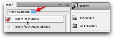 The extension is accessed via the Flash Audio Kit section of the Insert Panel (Window > Insert). Click the Insert Flash Audio button to launch the extension dialog. Shown here are both newer (CS4+) and older versions of Dreamweaver: